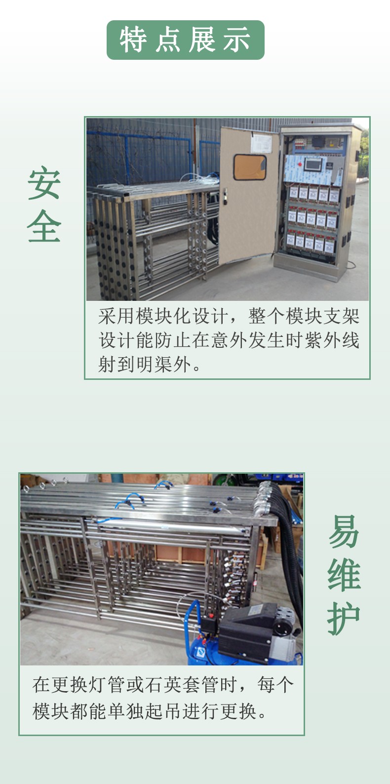 明渠式紫外線消毒設備應包括:紫外燈模塊組,模塊支架,配電中心,系統(tǒng)控制中心,水位探測及控制輸出等組成。