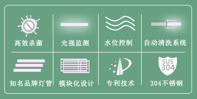 本紫外線消毒系統(tǒng)可根據(jù)水位的變化,自動關閉處于水位之上的燈管,防止燈管在無水的情況下,長時間點亮而引起不必要的損壞,也為在低水位時,達到相同消毒效果而不必改變單只燈管功率。既節(jié)約能源,又能使輻照能量達到所需劑量。當水位上升時,便自動打開相對應的燈管。